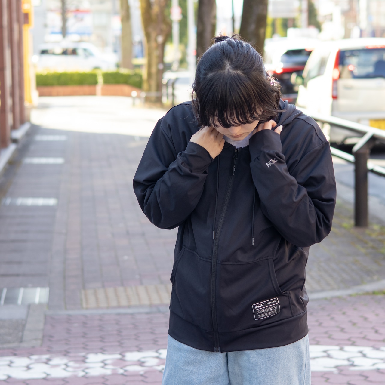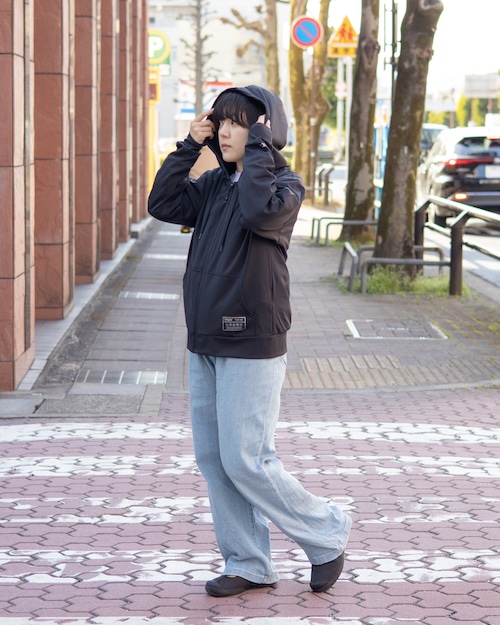 ブラックのワントーンに、袖のロゴと裾パッチがさりげないアクセント。